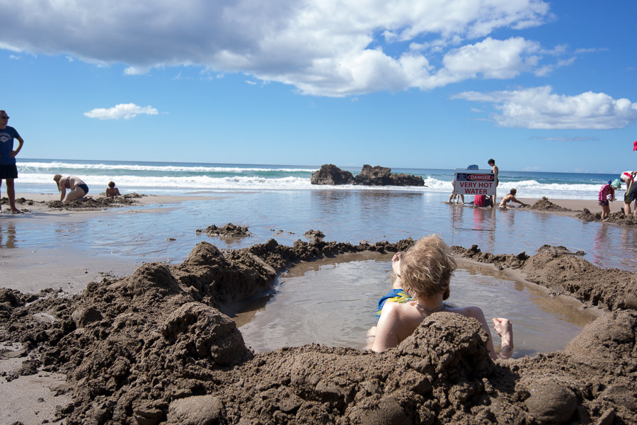 After a whole day of rain the forecast predicted two good days so we could move on. The Coromandels are really hilly and we had steeper hills than before in New Zealand. Back on the bikes we got to Hot Water Beach, a beach with a hot spring below so everybody has to dig a hole and you would have nice warm bathtub right at the beach. To cool down afterwards you can go for a swim in the sea, just awesome! Afterwards we went to Hahei and did a walk to Cathedral Cove which is a loveley beach with nice rock formations. After that we still cycled on to Ferry Landing to take a small ferry to get to Whitianga (in Maori a Wh=F). It was pretty late when we arrived there but we still cycled a bit out of the town to find a spott of grass at a farm. The next day, our last real cycle day in New Zealand, was the way to Coromandel Town. It was not very far, so we had a break in Whangapoua again at a nice beach.